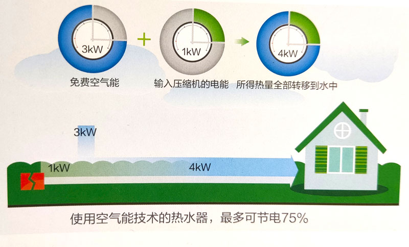 空气能是根据逆卡诺循环原理,机组以制冷剂为载体,以少量电能为驱动力,源源不断地吸取空气中难以利用的低品味热能,转化为可用的高品位热能,实现低温热能向高温热能的转移;再将高品位热能释放到水中制取生活热水,通过热水供应管路输送给用户满足生活热水及供暖需求。
