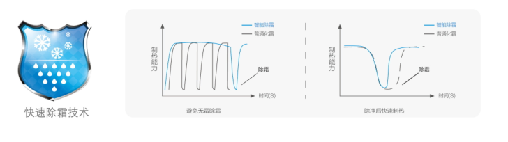 机组具备智能除霜控制,可根据结霜实际情况进入和退出除霜,相比固定时间的非智能除霜逻辑,可减少除霜频率和时间;保证除霜效果,不影响正常制热.从而真正实现有霜除霜,无霜制热,不浪费每一份热量。