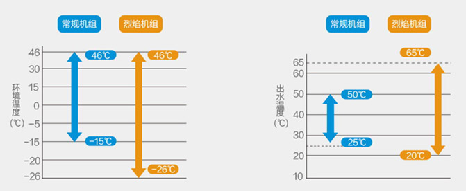 烈焰空气源热泵机组具有十分宽广的使用范围,可以在-26~46℃室外温度下稳定运行*。