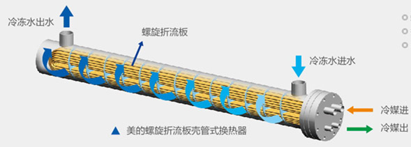 10匹以上机型(不包含10匹)采用带螺旋式折流板的壳管换热器。相对于普通的对称式折流板,它没有水流死区,换热面积利用更充分可有效降低冷凝温度,提高机组能效。且水阻也有所下降,可节省水泵运行费用。